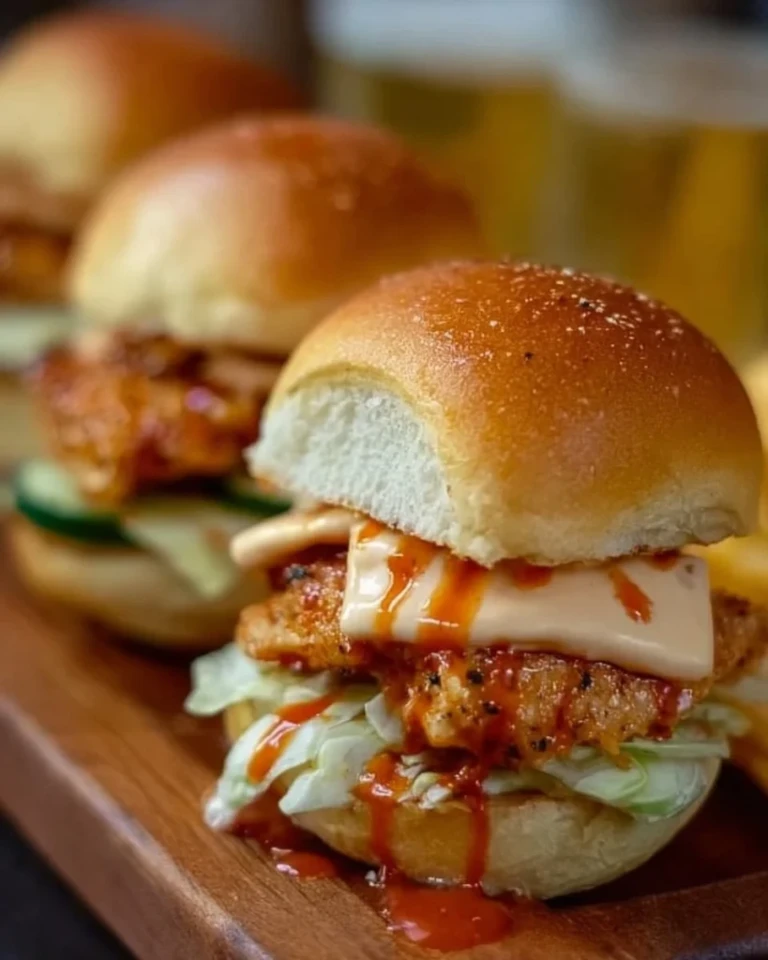 Delicious sliders featuring crunchy fried chicken and zesty Bang Bang sauce, perfect for gatherings or a fun dinner at home.