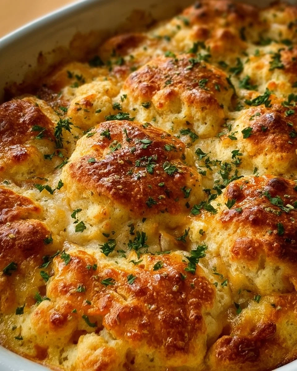 A comforting casserole combining tender chicken, creamy sauce, and fluffy biscuits that’s perfect for family dinners.