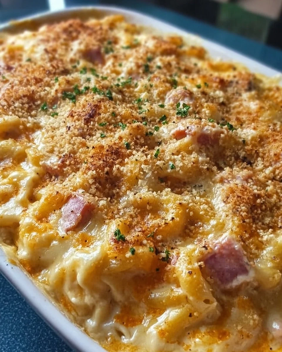 A comforting one-pan meal combining chicken, ham, and cheese, perfect for family dinners or potlucks.