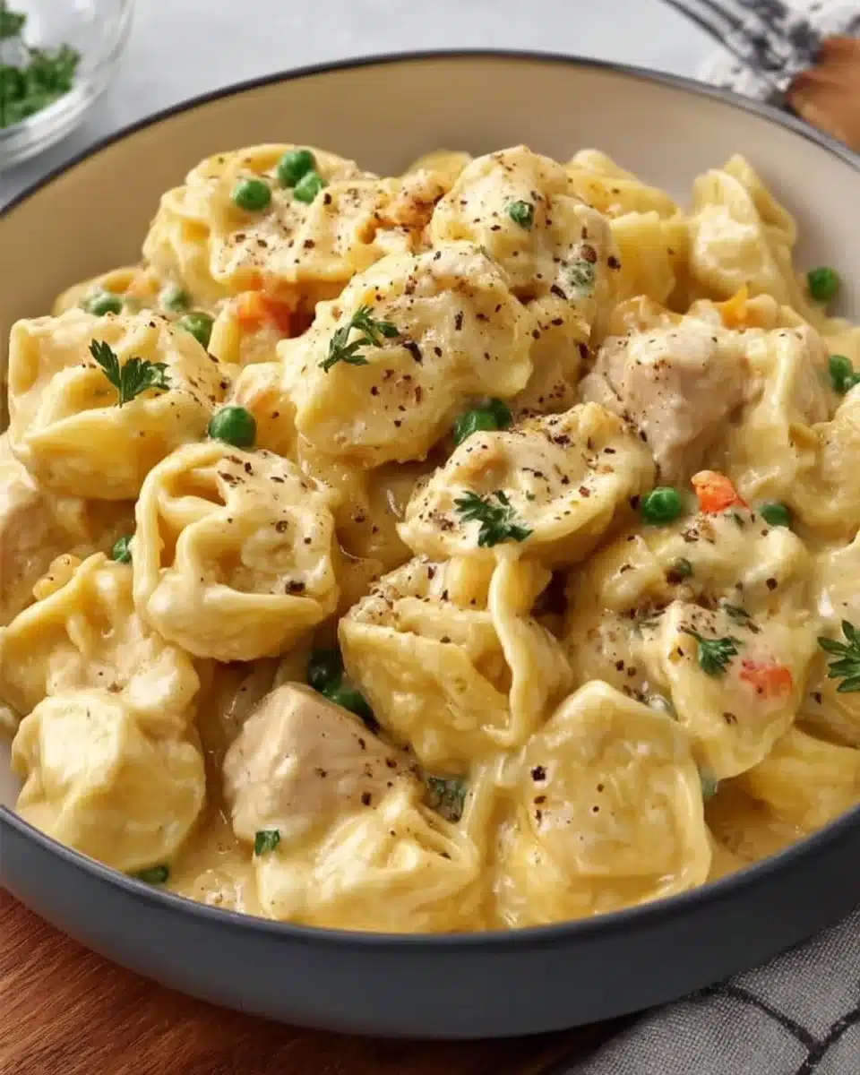 A creamy and cozy meal combining tender chicken, vibrant vegetables, and cheesy tortellini, perfect for busy families.