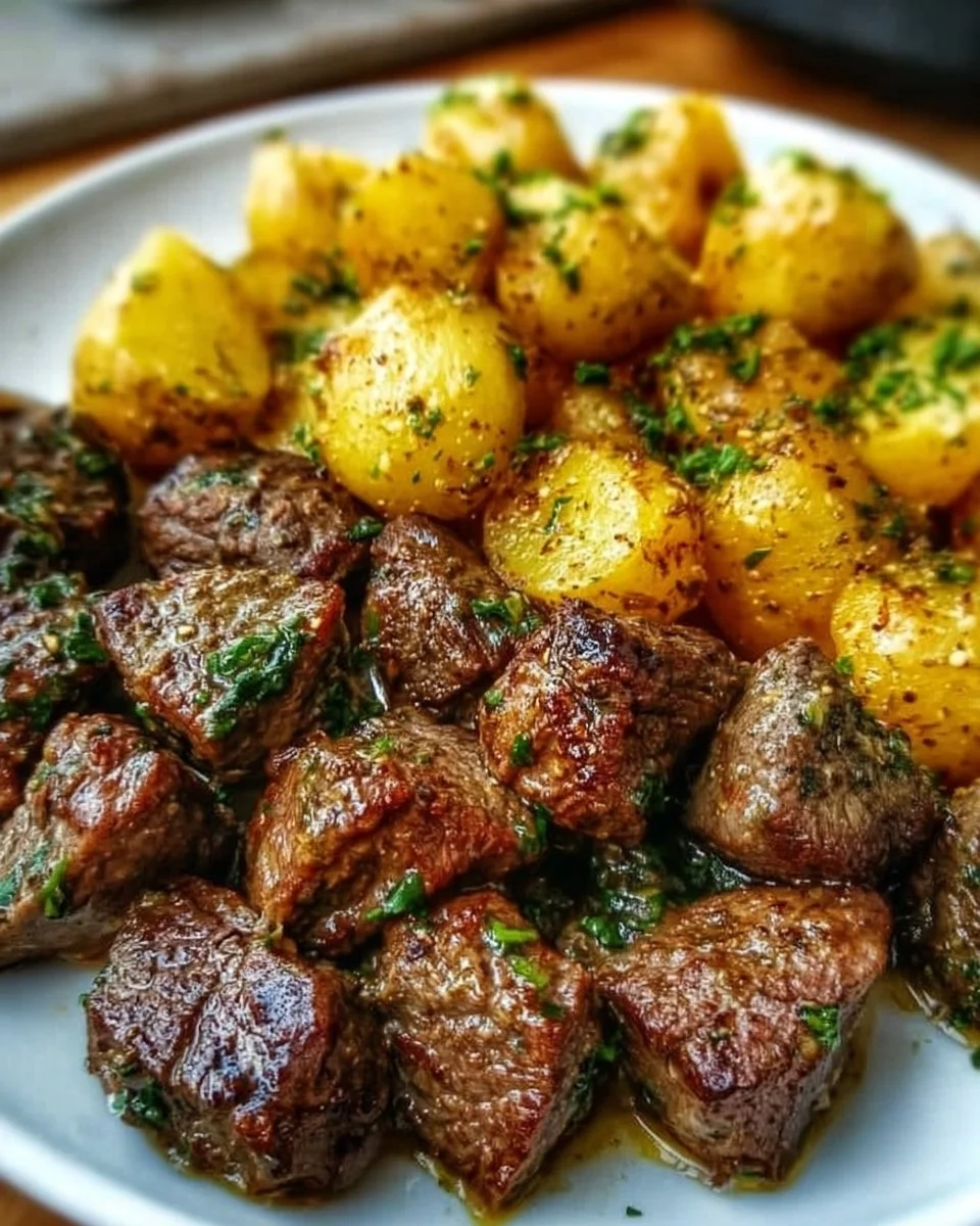 A comforting dish featuring tender beef bites cooked in a flavorful garlic butter sauce with soft baby potatoes.