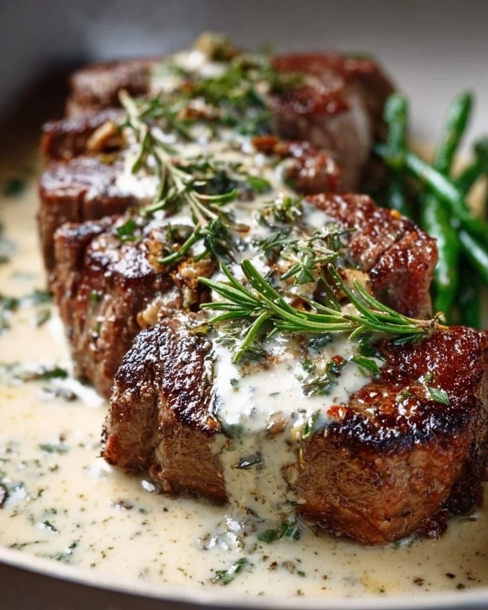 - Slice the steaks, plate them, and drizzle the Parmesan cream sauce over the top. Garnish with chopped parsley.