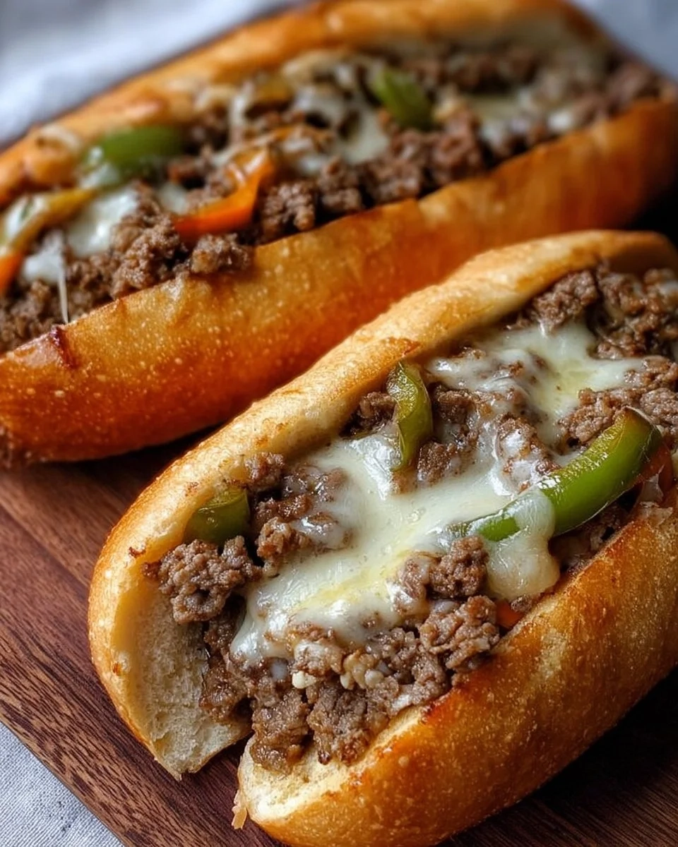 Quick and satisfying Ground Beef Philly Cheesesteaks filled with sautéed onions, melted provolone cheese, and seasoned beef, all in a soft hoagie roll.