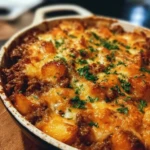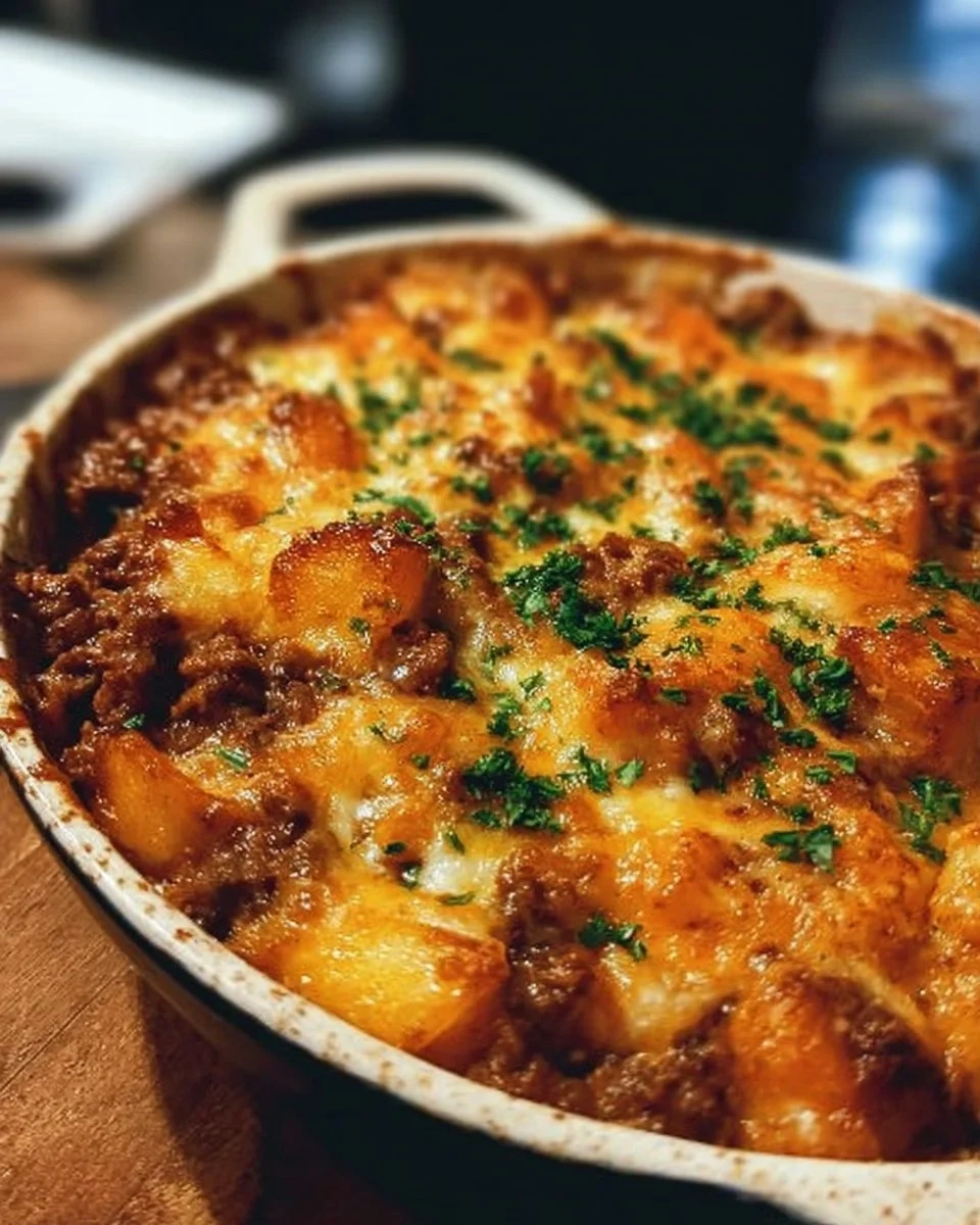 A hearty and easy-to-make casserole combining ground beef, potatoes, and cheese.