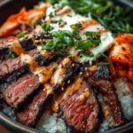 Keywords: Korean BBQ, steak rice bowl, quick dinner, marinated steak, spicy cream sauce, Asian cuisine