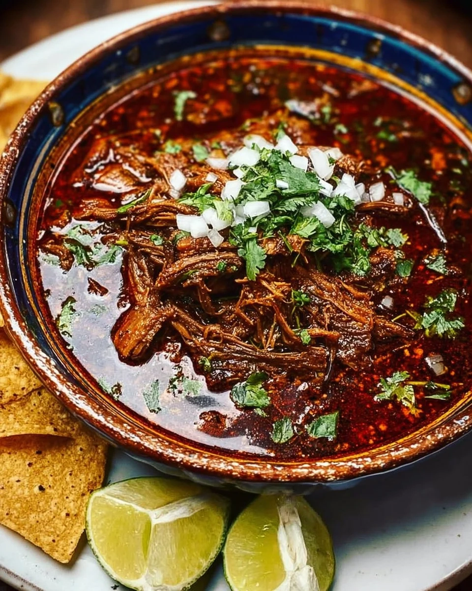 A flavorful Mexican dish featuring slow-cooked beef chuck in a rich and spicy broth, perfect for serving plain or in tacos.