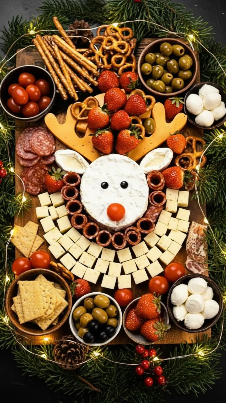 The reindeer face is built around a round wheel of brie, with cheese cubes, olives, crackers, salami roses, and strawberries arranged to create the full design. Pretzels form the antlers, giving the board its adorable, instantly recognizable look.