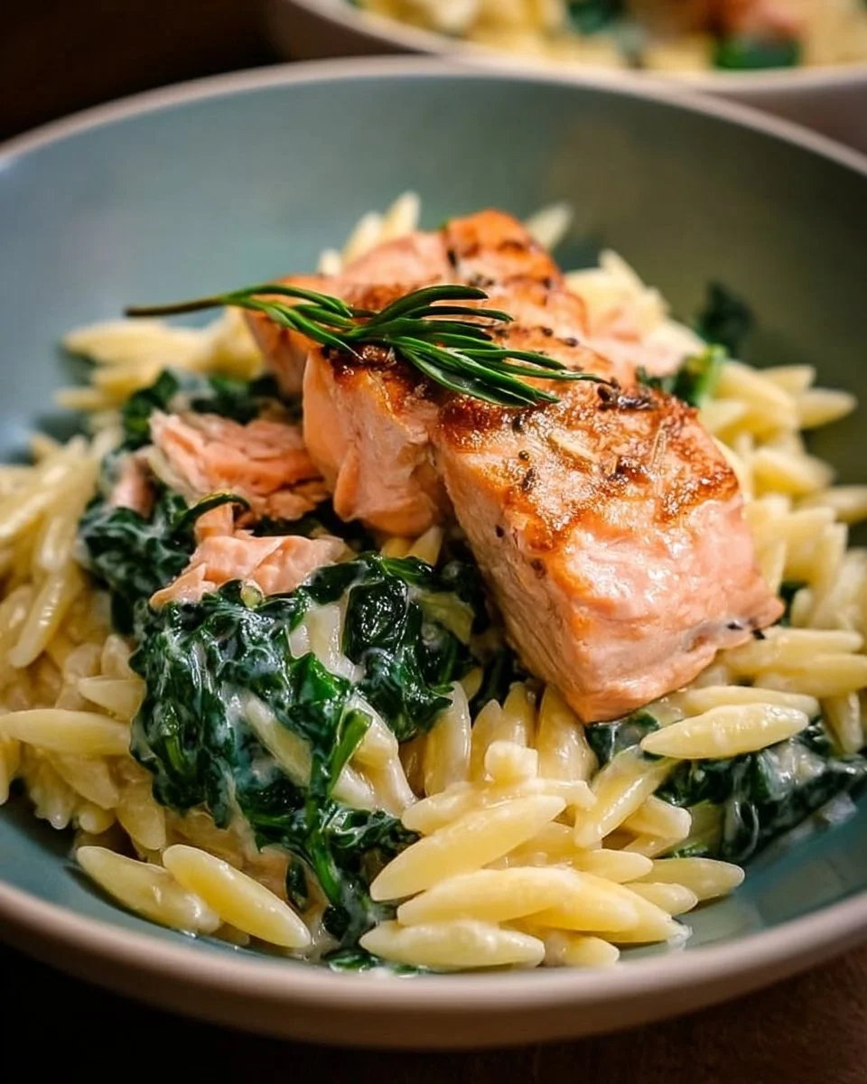 A tasty and comforting dish that combines flaky salmon, fresh spinach, and creamy orzo in one pot, perfect for a weeknight dinner or impressing guests.