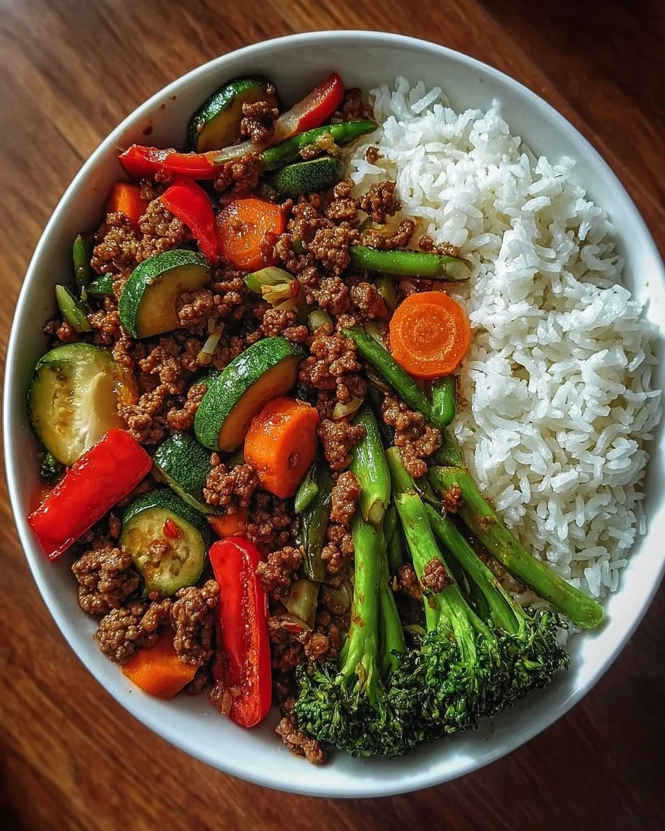 Spicy Ground Beef Stir-Fry Bowl with Garlic Veggies & Steamy Rice