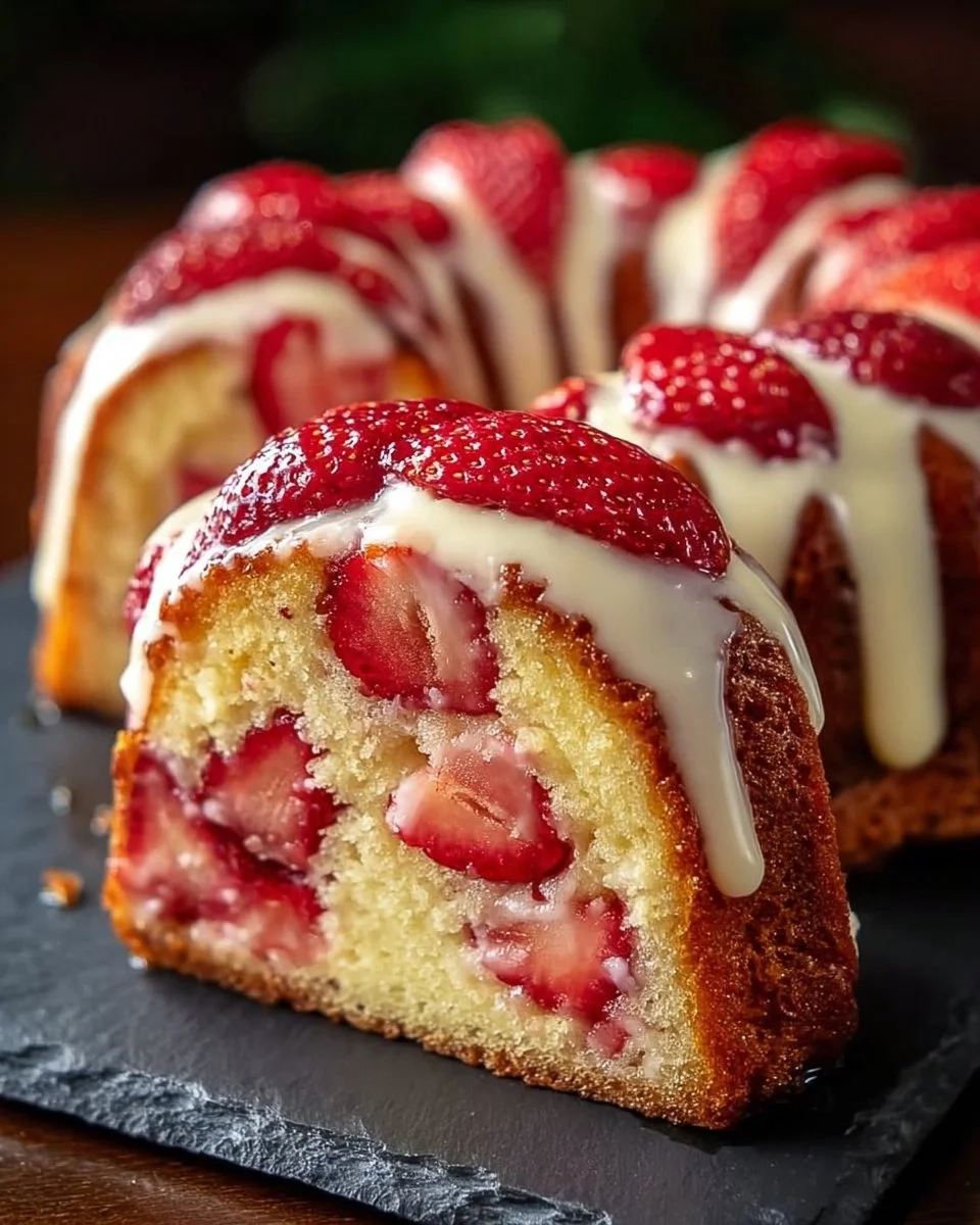 A delightful pound cake featuring a rich cream cheese texture and fresh strawberries, perfect for any occasion.